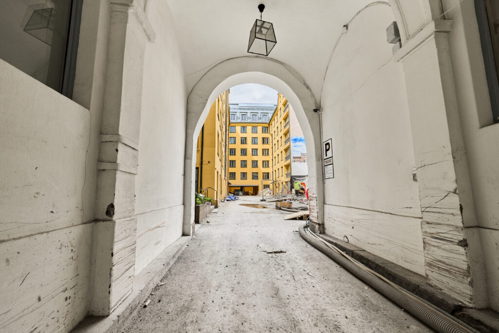 Passasjen som i dag sørger for gjennomgang mellom Dronningens gate og Kirkegata skal oppgraderes og gjøres tilgjengelig for byens befolkning. Samtidig ønsker vi å knytte gårdsrommet til Krigsskolen sammen med gårdsrommet i Dronningens gate 13.